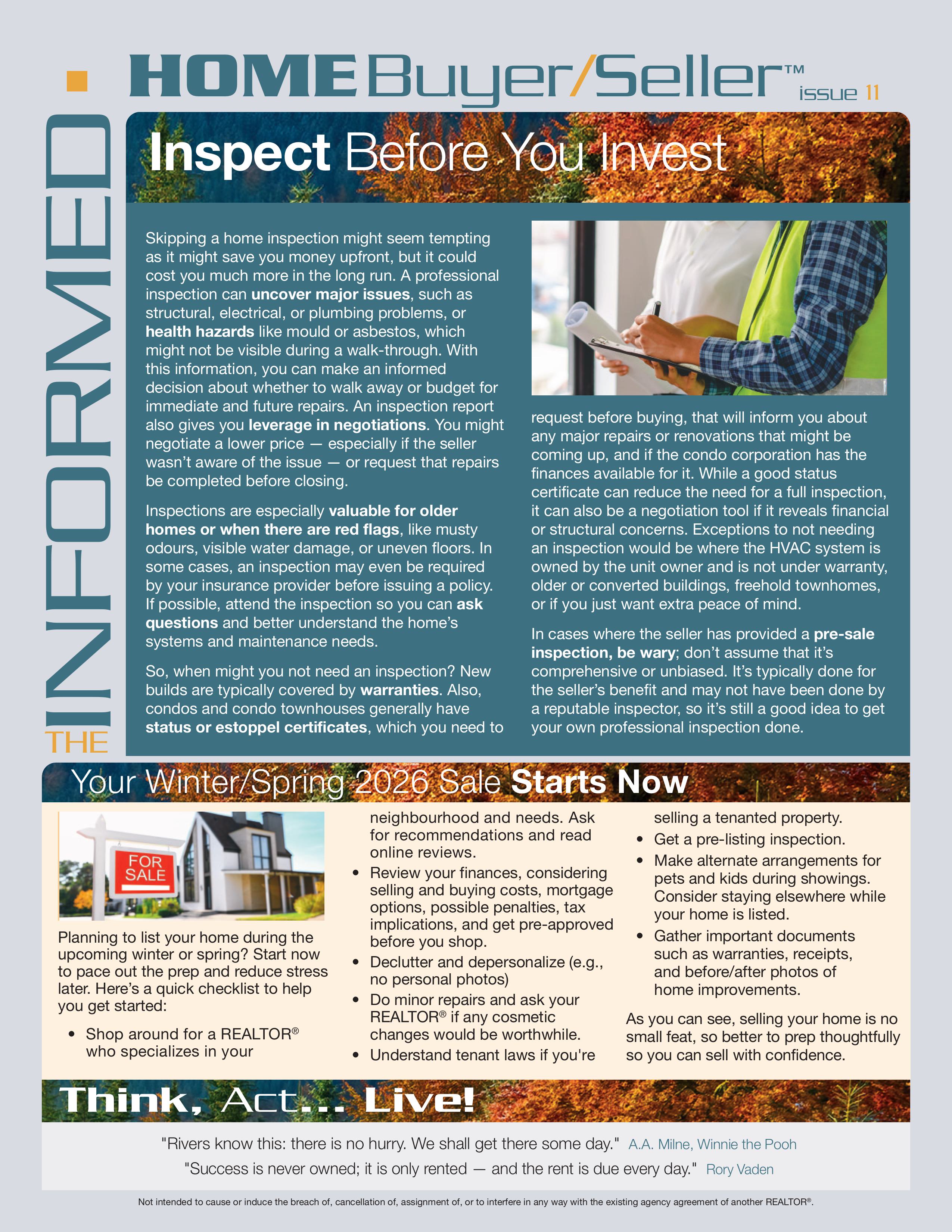 Skipping a home inspection might seem tempting as it might save you money upfront, but it could cost you much more in the long run. A professional inspection can uncover major issues, such as structural, electrical, or plumbing problems, or health hazards like mould or asbestos, which might not be visible during a walk-through. With this information, you can make an informed decision about whether to walk away or budget for immediate and future repairs. An inspection report also gives you leverage in negotiations. You might negotiate a lower price — especially if the seller wasn’t aware of the issue — or request that repairs be completed before closing.